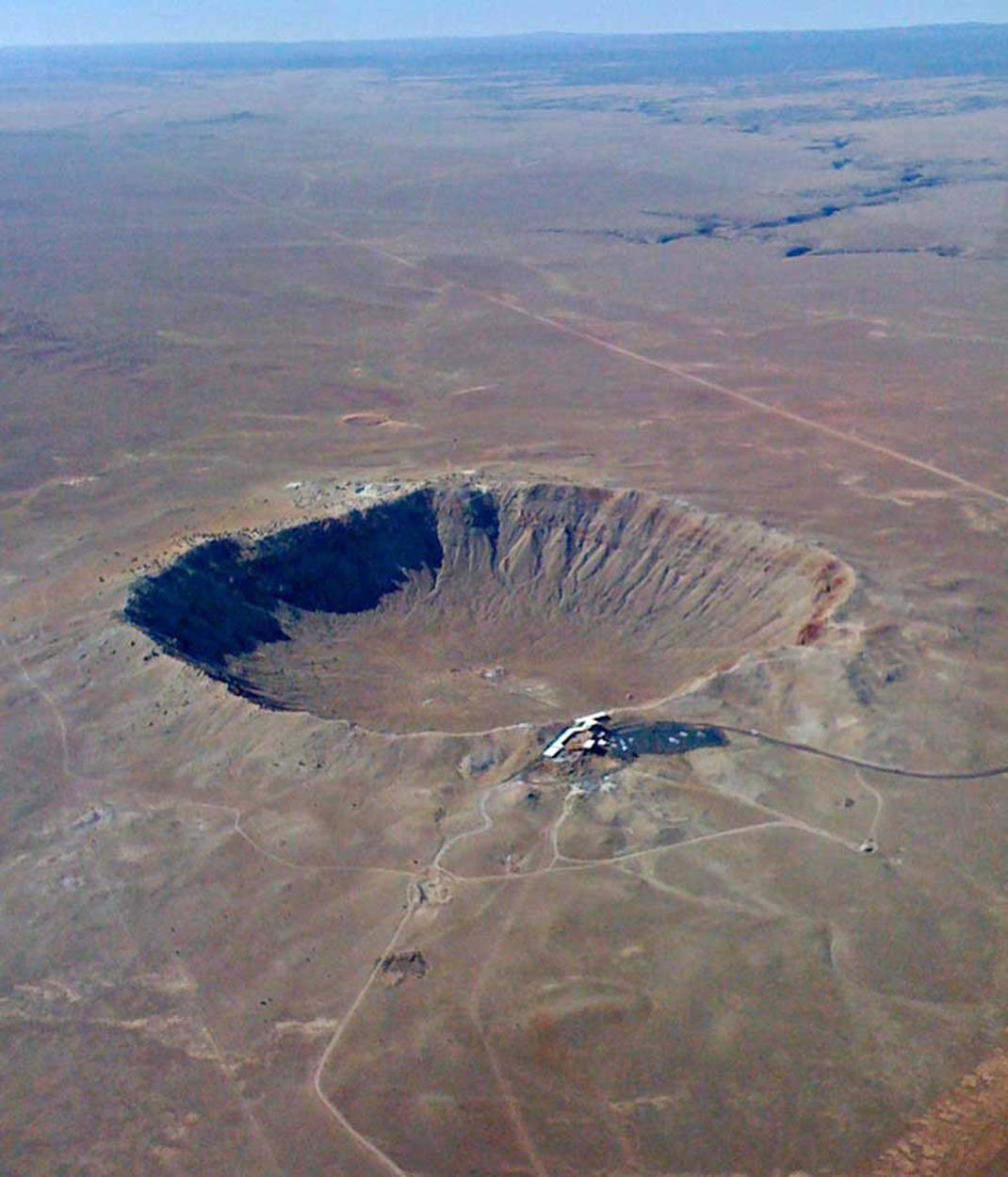 Meteor Crater, Arizona. At over 1 km (.74 miles) across, this crater was made by a meteor only 50 meters (160 ft) in diameter. CREDIT: NASA